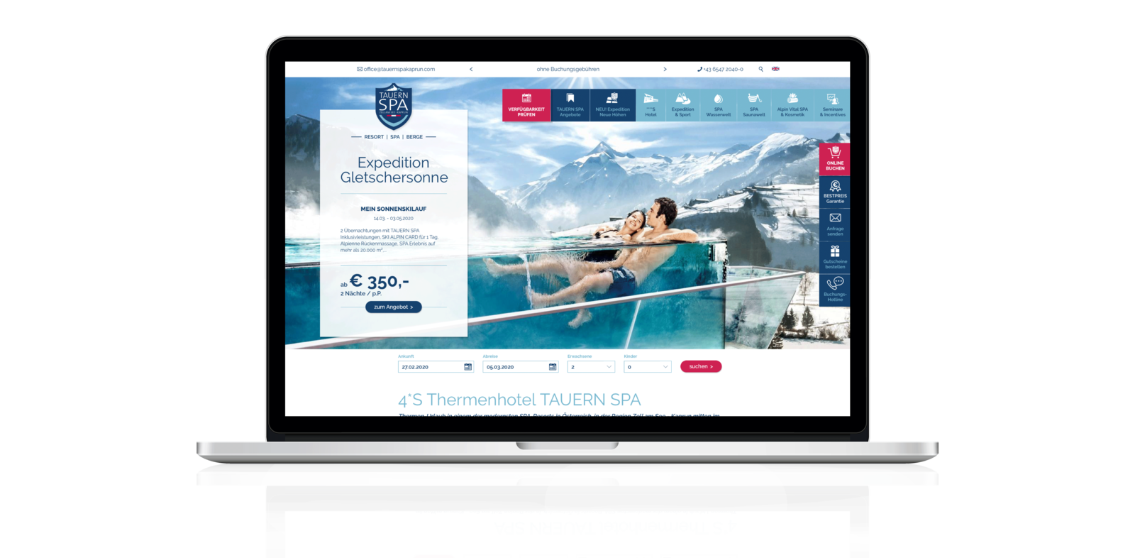 Das Tauern SPA ist eine der führenden Thermen in Österreich und ein Refugium für Ruhesuchende, eingebettet im Panorama der Salzburger Bergwelt. Das Angebot in Kaprun umfasst neben der 20.000 m² großen Wasser- & Saunawelt ein modernes 4*S Hotelresort mit einem großzügigen SPA und einer umfassenden Auswahl an Sportmöglichkeiten und Ausflugszielen, die unter dem Thema Expeditionen zusammengefasst und aktiv kommuniziert werden. Gäste kommen aus ganz Europa und buchen ihren Aufenthalt häufig im Voraus über die Webseite.